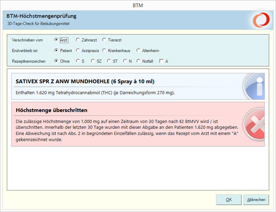 BtM-Verordnungsprüfung mit 30-Tage-Höchstmengencheck direkt im POS-Dialog von INFOPHARM®-Profiline