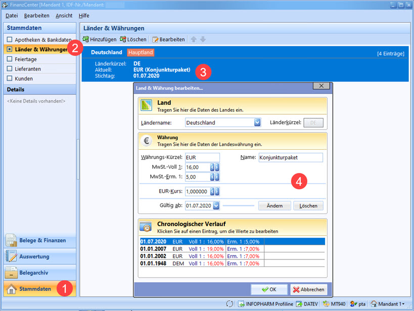 Die Umstellung ist damit abgeschlossen. Bei Belegen mit Datum ab 01.07.2020 werden Umsatzsteuer/Vorsteuer nun innerhalb des FinanzCenters mit den reduzierten Steuersätzen 16% (voll) und 5% (ermäßigt) ausgewiesen und beim Datenexport gemäß den Vorgaben der Buchhaltung aufbereitet.