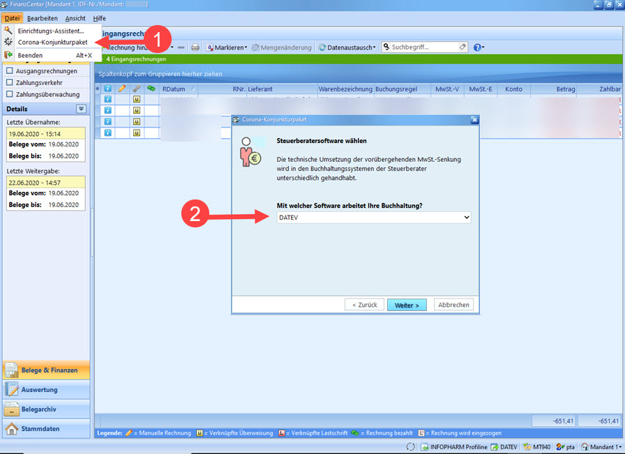Starten Sie den Menüpunkt „Datei, Corona-Konjunkturpaket“ und befolgen Sie die Schritte des Assistenten. Die Umstellung wird einmalig durchgeführt. Wählen Sie im Schritt „Steuerberater“ die Auswahl „DATEV“.