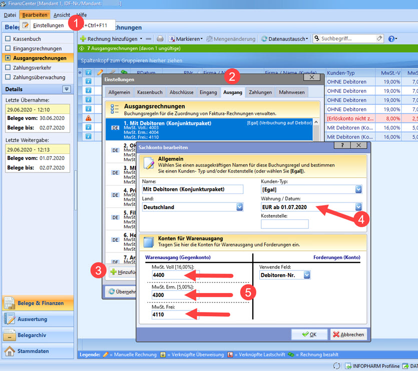 Ausgangsrechnungen mit Datum ab 01.07.2020 und Steuersätzen 16% (voll) und 5% (ermäßigt) werden nun im FinanzCenter korrekt dargestellt.