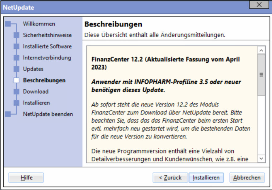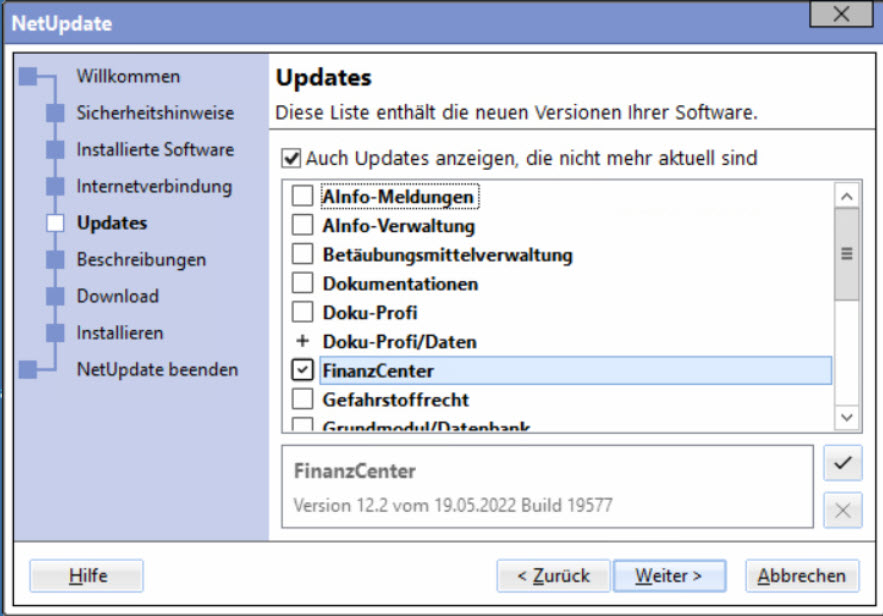 Bitte wählen Sie dazu die Funktion „NetUpdate“ und im Schritt „Updates“ den Schalter „Auch Updates anzeigen, die nicht mehr aktuell sind“. Nach Eingabe des Sicherheitscodes können Sie in der Liste das Modul „FinanzCenter“ anwählen. Nach dem bestätigen mit der Schaltfläche „Weiter“ wird die Update-Beschreibung angezeigt. Dort sehen Sie den Hinweis auf die aktualisierte Fassung vom April 2023.