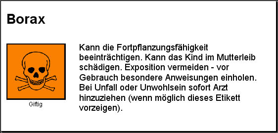 Außerdem wurde die Einstufung von Borax aktualisiert. Der Gefahrstoff ist nun als „giftig“ eingestuft und somit mit einem „Totenkopf“ gekennzeichnet. Ein neues Sicherheitsdatenblatt wurde ebenfalls im Programm hinterlegt.