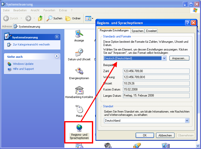 Lösung: Korrigieren Sie die Ländereinstellung in der Systemsteuerung (Regions- und Sprachoptionen) auf „Deutschland“.