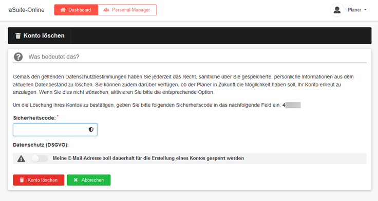 Sie können jederzeit Ihr Benutzerkonto auf asuite-online löschen. Diese Funktion steht sowohl für Planer als auch Mitarbeiter zur Verfügung. Beim Löschen des Benutzerkontos kann gewählt werden, ob Ihre E-Mail-Adresse dauerhaft gesperrt bleiben soll.
