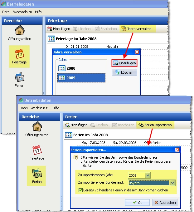 Feste Feiertage können bequem in das neue Jahr übernommen werden. Dazu wird über die Funktion ‚Jahre verwalten‘, ‚Neu‘ das Jahr 2009 angelegt. Die verbleibenden beweglichen Feiertage können über ‚Feiertag hinzufügen‘ erfasst werden.