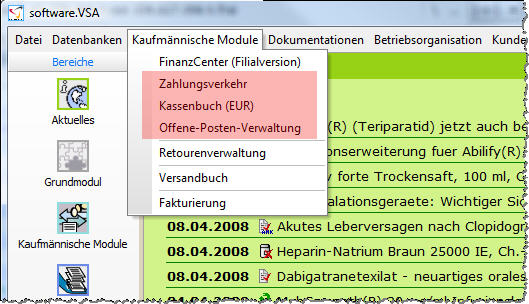 Bitte beachten Sie, dass der Aufruf der Module Kassenbuch, Zahlungsverkehr und Offene Posten nach Einspielen der Version 7.0 nicht mehr über den Bereich „Kaufmännische Module“ der linken Navigationsleiste erfolgt, sondern über die textuelle Menüleiste am oberen Fensterrand.